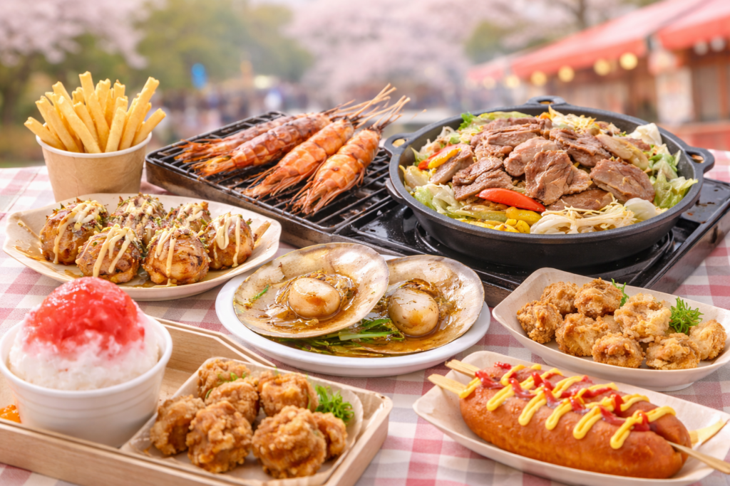松前さくらまつりの屋台では、子どもが食べやすい定番メニューが中心のほか、北海道らしいジンギスカンや海鮮焼きなどが勢揃いします。