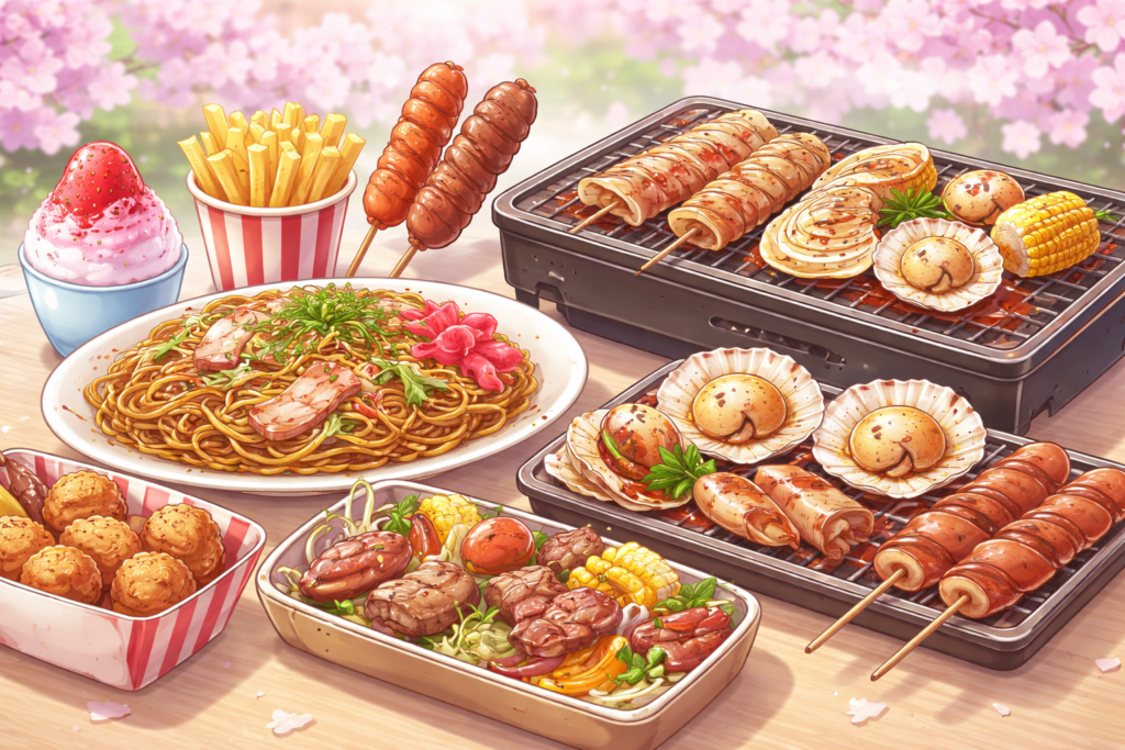 ただし、油ものが続くと子どもが疲れやすくなることもあるので、軽めのおにぎりや飲み物を持参して、屋台と組み合わせると安心です。
